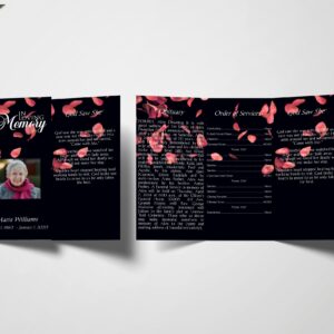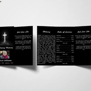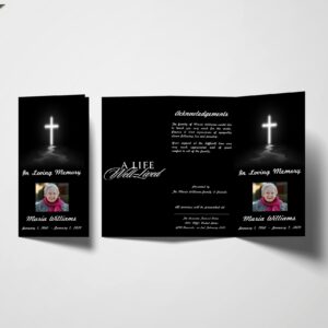 This Black Candle Light Trifold Funeral Program Template 3 folds with 6 editable and printable sides where you can add your own content such as order of service details and other funeral service details.