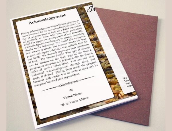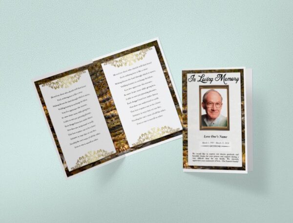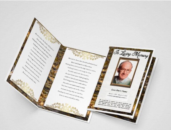 This Golden Autumn Funeral Template contains 1 folds with 4 editable and printable sides where you can add your own content such as order of service details and other funeral service details.