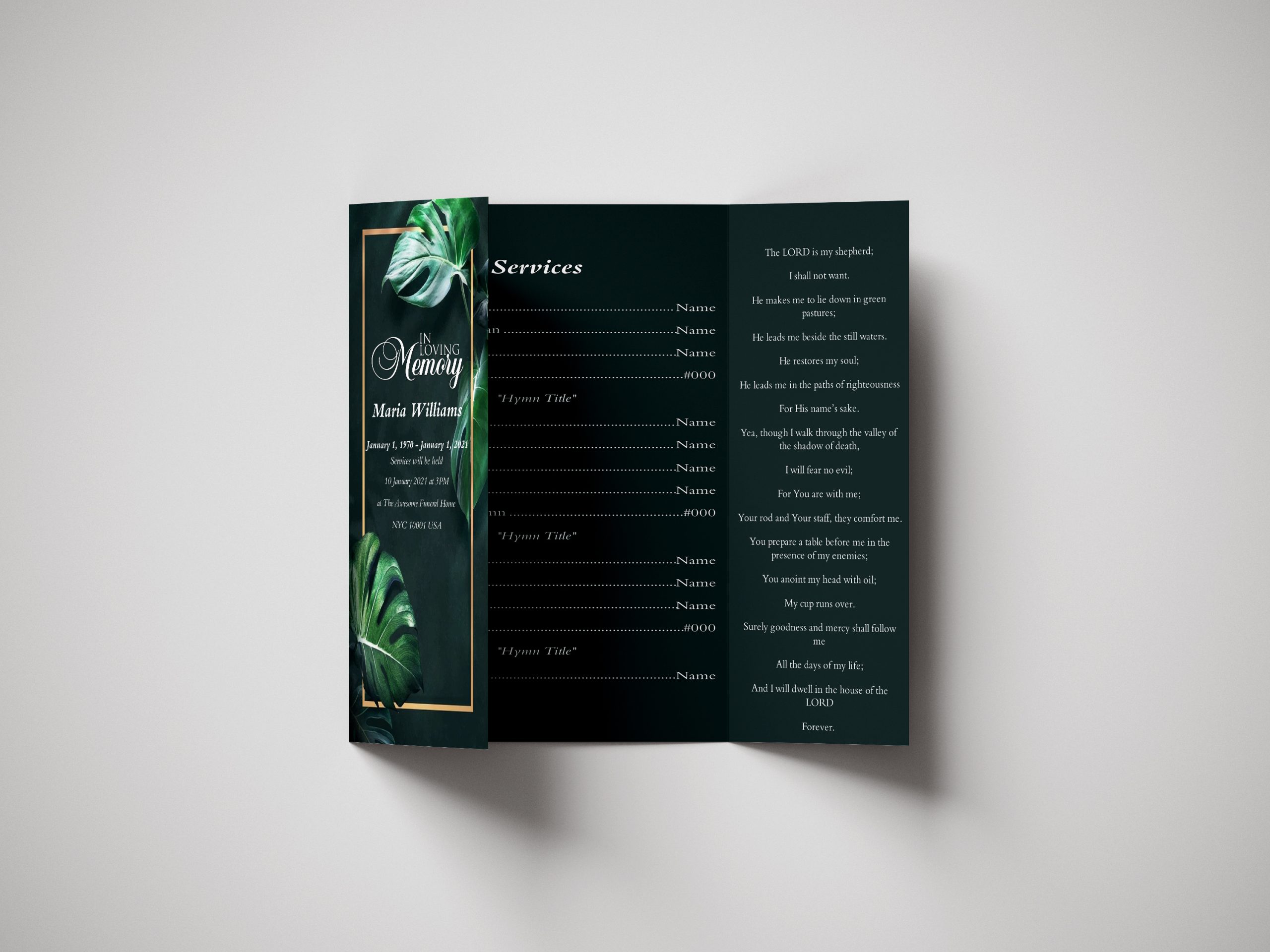 Searching for a Monstera Leaves Gate Fold Funeral Program Template  that is easy to print has a cutting-edge look? This Non-Religious Monstera Leaves Gate Fold Funeral Program Template Letter Size is the Perfect decision that is having a measure of 8.5”x 11” for Gatefold funeral programs.