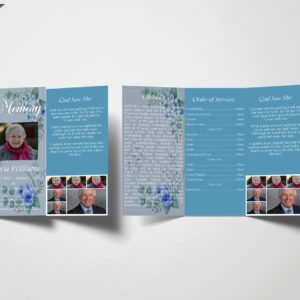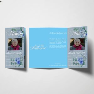 This Platinum Trifold Funeral Program Template 3 folds with 6 editable and printable sides where you can add your own content such as order of service details and other funeral service details.