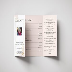 There are actually many other designs and sizes of programs that a funeral director will help you with. You can also shop online with a variety of sites that specialize in helping you to design programs and will have many funeral templates for programs available for you to choose from.
